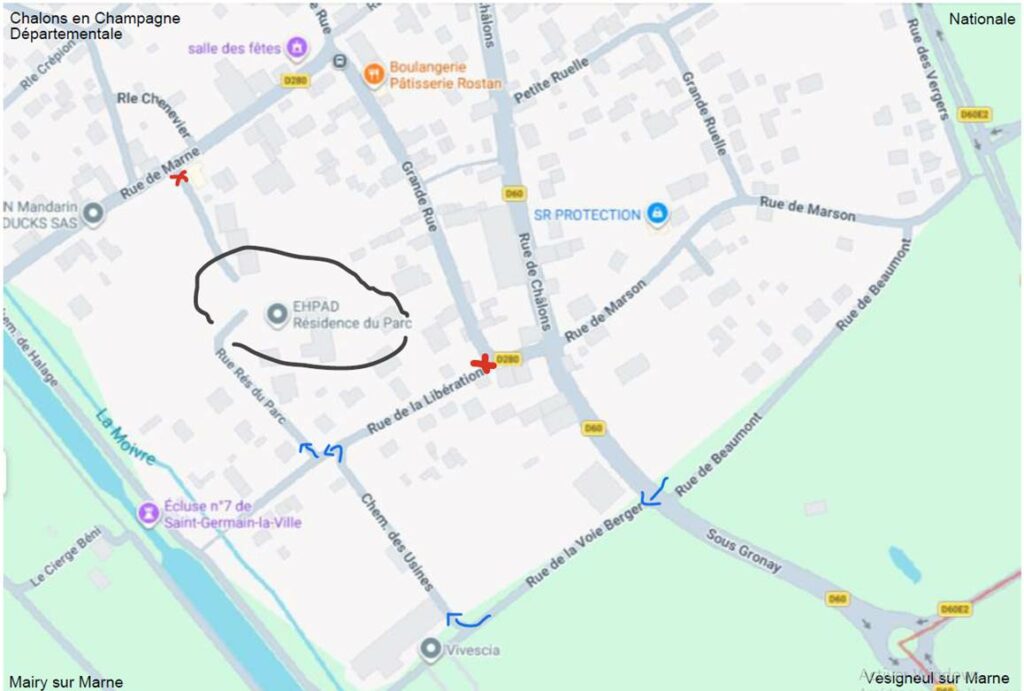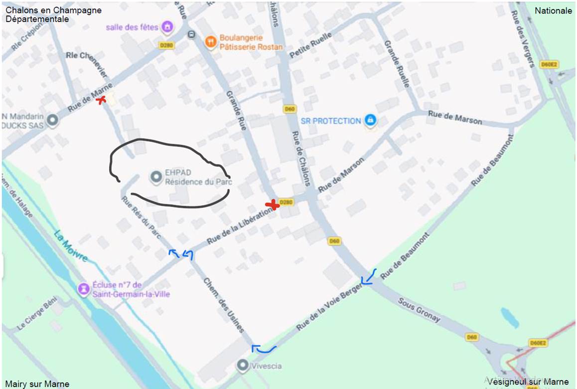 ➡️ Empruntez la rue de la Voie Berger, située entre l’entrée du village de Saint‑Germain‑la‑Ville (côté Vesigneul) et le rond‑point.